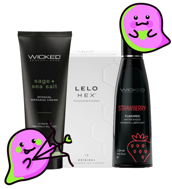 Introducing the Wicked Valentin's Essentials Bundle – a curated collection to enhance your intimate moments and elevate your experiences. This enticing trio includes the Wicked Sage + Sea Salt Massage Cream (4oz), the Wicked Aqua Strawberry lubricant, and a 12-pack of Lelo Hex Original Condoms.